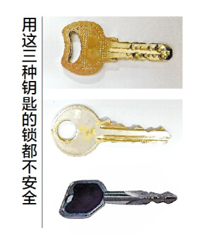 您家的鎖能防盜嗎?黑龍科技陳永江經(jīng)理告訴您兩個(gè)最簡單的方法:一、將鑰匙的一小部分插進(jìn)鎖孔,用力擰住,再往前推,如果鑰匙推不進(jìn)去,這個(gè)鎖具就容易被打開。二、看鑰匙形狀。鑰匙是十字形、單面鋸齒形、鑰匙槽上有圓點(diǎn)的,建議您換鎖。