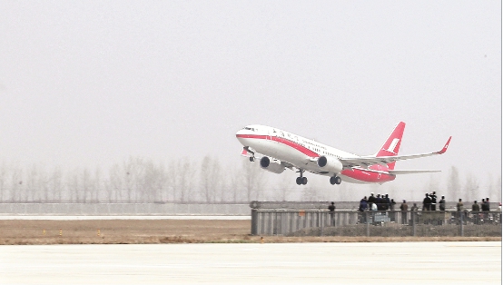 3月31日,上海航空FM9142次航班順利起飛,標(biāo)志著秦皇島北戴河機(jī)場轉(zhuǎn)場通航成功。記者 劉曉攝
