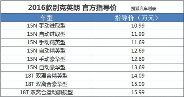 2016款別克英朗日前正式公布售價,新車推出6款15N以及3款18T共計9款車型,售價區(qū)間10.99-15.99萬,與在售版本保持一致。2016款英朗在動力、配置方面進(jìn)行了升級。