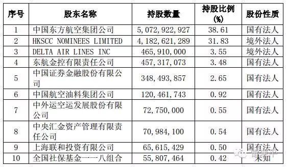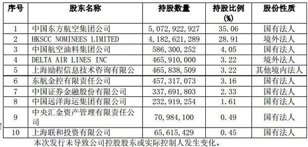 此次發(fā)行前,東方航空前3大股東分別為中國東方航空集團(tuán)公司,持股38.61%;HKSCC NOMINEES LIMITED,持股31.83%,DELTA AIR LINES INC,持股3.55。