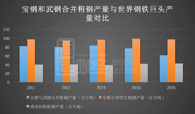 2013年,武鋼集團營業(yè)收入創(chuàng)下2270億的高點后持續(xù)暴跌,到2015年僅剩約1018億元,兩年時間下跌超過55%。 2010年武鋼集團員工數(shù)高達(dá)117529人,到2015年底時只剩82025人,五年間裁員超過35500人,削減幅度超過三分之一。今年五月,國務(wù)院總理李克強在武鋼考察期間說:“對于武鋼,從運輸半徑角度講,生產(chǎn)一般粗鋼等產(chǎn)品,遠(yuǎn)不如沿海地區(qū)有競爭力,因此必須用壯士斷腕的決心和勇氣,把過剩產(chǎn)能化解掉” 武鋼還只是鋼鐵行業(yè)虧損和裁減員工的一個縮影。近日召開的夏季達(dá)沃斯論壇上,國家發(fā)改委主任徐紹史稱,今年將要去掉鋼鐵行業(yè)產(chǎn)能4500萬噸,安置員工18萬人。 寶鋼武鋼重組:巨無霸真能扭轉(zhuǎn)乾坤? 寶鋼集團的日子也不好過,根據(jù)相關(guān)債券公告的信息,去年寶鋼集團2015年虧損額達(dá)到15.46億,旗下上市公司八一鋼鐵、韶鋼股份今年一季度仍處于虧損中,其中八一鋼鐵過去2年多虧損金額接近50億元。 就在重組消息證實前不久,寶鋼集團旗下的寶鋼不銹2500立方高爐在運行了17年后正式停產(chǎn),去年寶鋼粗鋼產(chǎn)量已經(jīng)較2014年減少了接近兩成。 去年,寶鋼集團的粗鋼產(chǎn)量約為3493萬噸,武鋼集團的粗鋼產(chǎn)量為2577萬噸,兩者分別位居全球第五和第十一位。合并后鋼鐵總產(chǎn)量將突破6000萬噸,將成為僅次于安賽樂米塔爾的世界第二大鋼鐵企業(yè),超越韓國浦項制鐵。下圖為寶鋼武鋼與世界鋼鐵巨頭的產(chǎn)量對比: