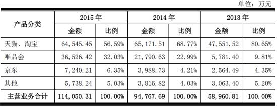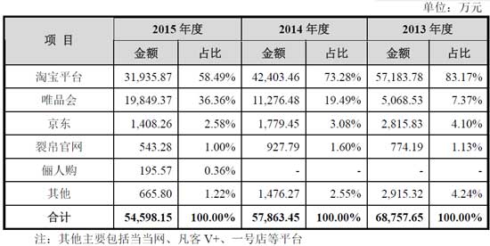 茵曼來自各平臺的數(shù)據(jù)(來自茵曼招股書) 從渠道構(gòu)成看,茵曼來自淘寶和天貓銷量2013年到2015年分別是4.75億元、6.5億元、6.45億元,占比分別為80.65%、68.77%、56.59%,占比持續(xù)降低,銷量在2015年還出現(xiàn)下降。 來自唯品會的銷量2013年到2015年分別是5781萬元、2.17億元、3.6億元,占比分別為9.81%、22.99%、32.03%。 裂帛2013年來自淘寶收入占83.17%,來自唯品會收入占7.37%,來自京東收入占4.1%。到2015年,裂帛來自淘寶收入占58.49%,來自唯品會收入占36.36%,來自京東收入占2.58%。 裂帛來自淘寶和京東平臺收入占比的下降,并非是裂帛的收入大幅增加造成的,實(shí)際上,裂帛2013年來自淘寶的收入為5.71億,到2015年降至3.19億元,下降幅度高達(dá)44.1%。