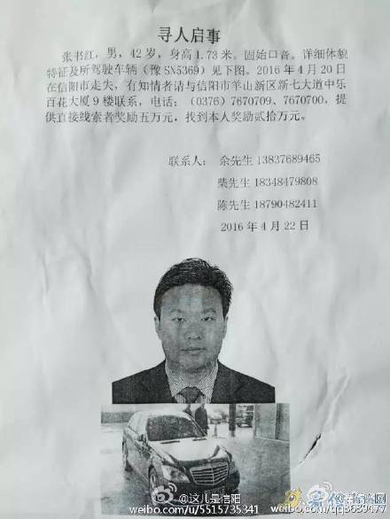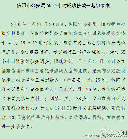 官方通告 網(wǎng)絡(luò)曝光圖 尋人啟事 本報訊 綁架勒索,得手后撕票,致一名公司老總死亡。今晨,信陽警方通報,通過65小時奮戰(zhàn),此案3名犯罪嫌疑人已經(jīng)落網(wǎng)。 今天凌晨零時45分,信陽市