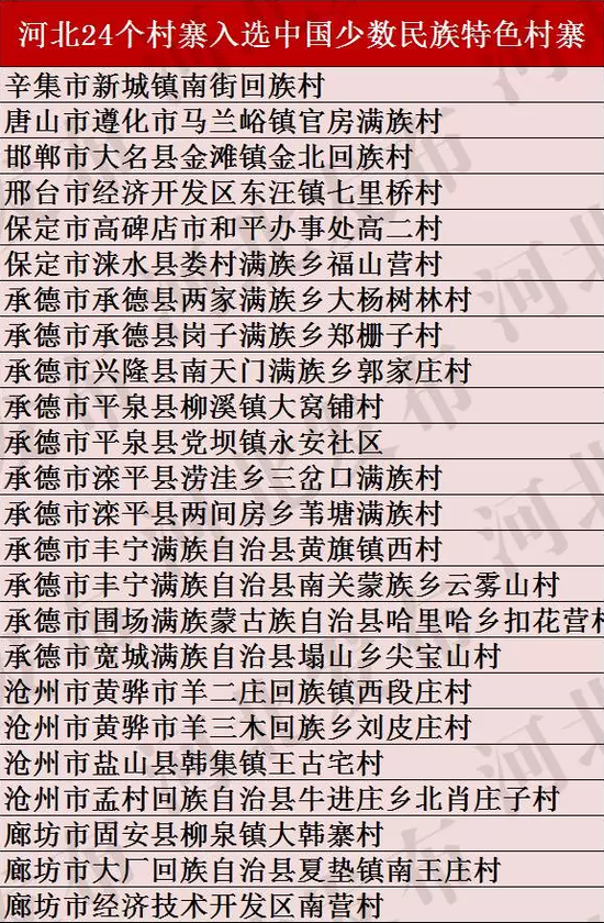 近日,國家民委發(fā)布《關(guān)于命名第二批中國少數(shù)民族特色村寨的通知》(民委發(fā)﹝2017﹞34號),全國共有717個村寨被作為第二批中國少數(shù)民族特色村寨予以命名掛牌,其中河北有24個村