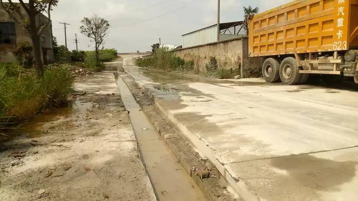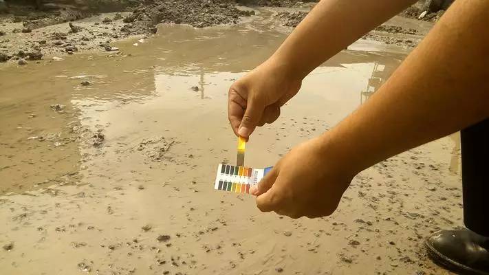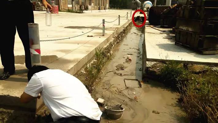 通過圖中的缺口,污水流到了廠外 “紫色對應的pH值一般為13到14,初步判斷,這些污水的酸堿度至少在12以上,為腐蝕性很強的強堿性污水!”崇明區(qū)環(huán)境監(jiān)察支隊副支隊長王春龍指著停在水泥落料車間一側的一排攪拌車說,這些污水,主要是沖洗落料車間散落的水泥和攪拌車所產(chǎn)生的。
