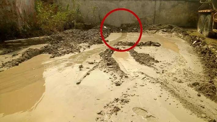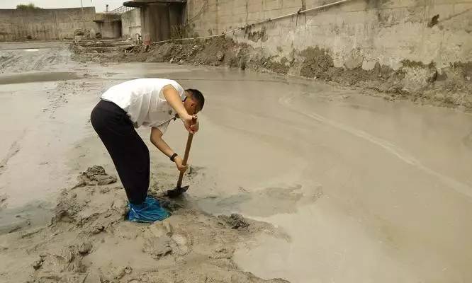 紅圈處就是雨水管 就在大家將注意力集中到廠外的溝渠時,另一路執(zhí)法人員通過仔細調(diào)查,還在該廠的深處發(fā)現(xiàn)了一個籃球場大小的“沼澤”,疑似是一處可以向地下滲透污水的滲坑。記者隨執(zhí)法人員進入“沼澤”內(nèi)部,不僅有刺鼻的氣味,灰色的污泥最深處還可以淹沒小腿肚,拿鏟子往下用力,發(fā)現(xiàn)可以插得更深,似乎底下還“別有洞天”。