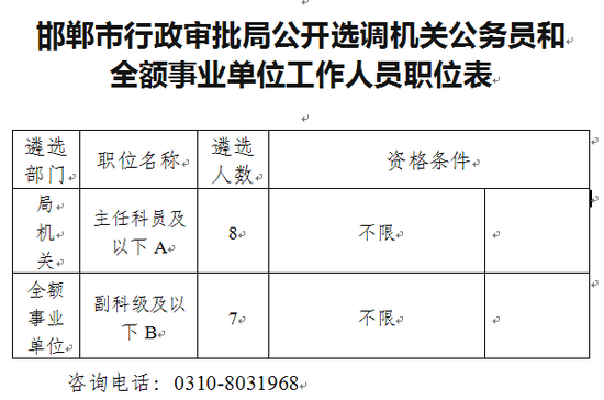邯鄲市行政審批局選調機關公務員和事業(yè)單位工作人員 根據(jù)工作需要,依據(jù)《河北省機關事業(yè)單位干部調配辦法》等有關規(guī)定,決定為市行政審批局面向全市公開選調機關公務員和全額