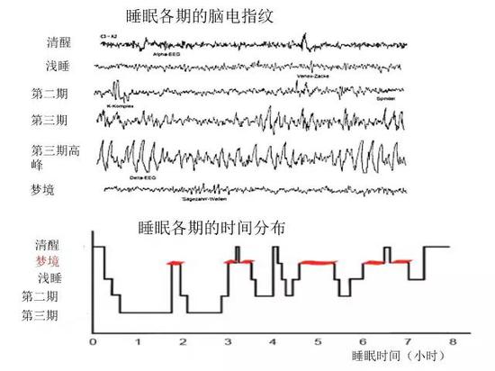 一夜睡眠的時相和分期 上: 睡眠分期的腦電指紋。睡前閉眼但清醒時腦電是8-12 赫茲的阿爾法波。進入第一期淺睡后腦電波變慢(西塔波)。睡眠加深到第二期時有偶爾的高波和紡錘波。深睡(第三期)以高幅度,低頻率的慢波腦電為主。夢境 時腦電與清醒時相似。下:睡眠各期在一夜間的循環(huán)。第一個小時中從淺睡,第二期到第三期,之后出現夢境。然后再進入第二期第三期。這個循環(huán)在一夜中出現幾 次。
