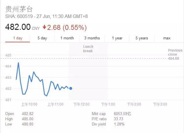 ▲圖片來源:茅臺2017年度一季報 根據(jù)茅臺公布的2017年度一季報顯示,茅臺在今年第一季度實現(xiàn)營業(yè)收入133億元,比去年同期增長33.24%;一季度凈利潤為61.23億元,比去年同期增長25.24%;每股收益也從去年同期的3.89元提高到4.87元。 一家茅臺頂35家互聯(lián)網(wǎng)公司 股價屢創(chuàng)歷史新高的A股“股神”貴州茅臺在昨天(6月26日)再次博得市場關注。茅臺股價昨天再度刷新歷史紀錄,收盤報484.68元,漲幅2.53%,總市值首次突破6000億元大關。 截至6月27日上午十一點半,茅臺股價暫報482元,市值6053.59億元。