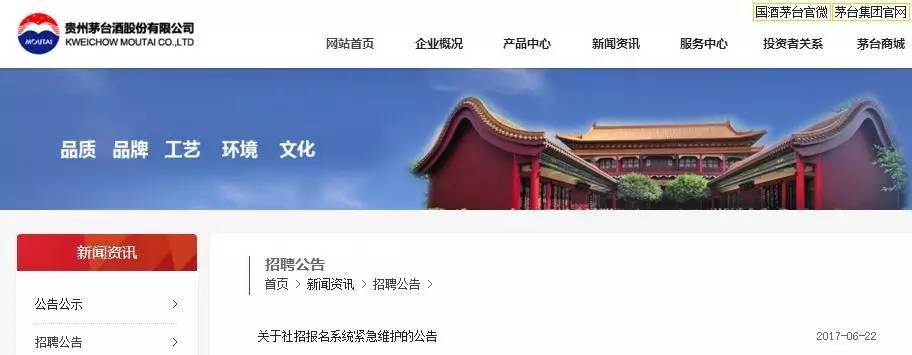▲圖片來源:茅臺官網(wǎng) 值得注意的是,茅臺本次招錄的人員均為合同學徒工,簽訂三年期勞動合同。根據(jù)招工簡章規(guī)定,工作表現(xiàn)差、不服從管理的,按公司規(guī)定處理并在合同期滿后不再續(xù)簽。 即使是學徒工崗位,也引來了只有公務員“國考”才能見到的罕見火爆競爭。茅臺原本設想的報名名額為2000人,但幾十萬人點擊報名,導致了報名系統(tǒng)崩潰。茅臺官網(wǎng)在6月22日發(fā)出了社招報名系統(tǒng)緊急維護的公告,分流報名流量。