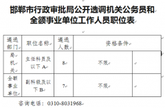 邯鄲市行政審批局選調(diào)機關(guān)公務(wù)員和事業(yè)單位工作人員 根據(jù)工作需要,依據(jù)《河北省機關(guān)事業(yè)單位干部調(diào)配辦法》等有關(guān)規(guī)定,決定為市行政審批局面向全市公開選調(diào)機關(guān)公務(wù)員和全額...